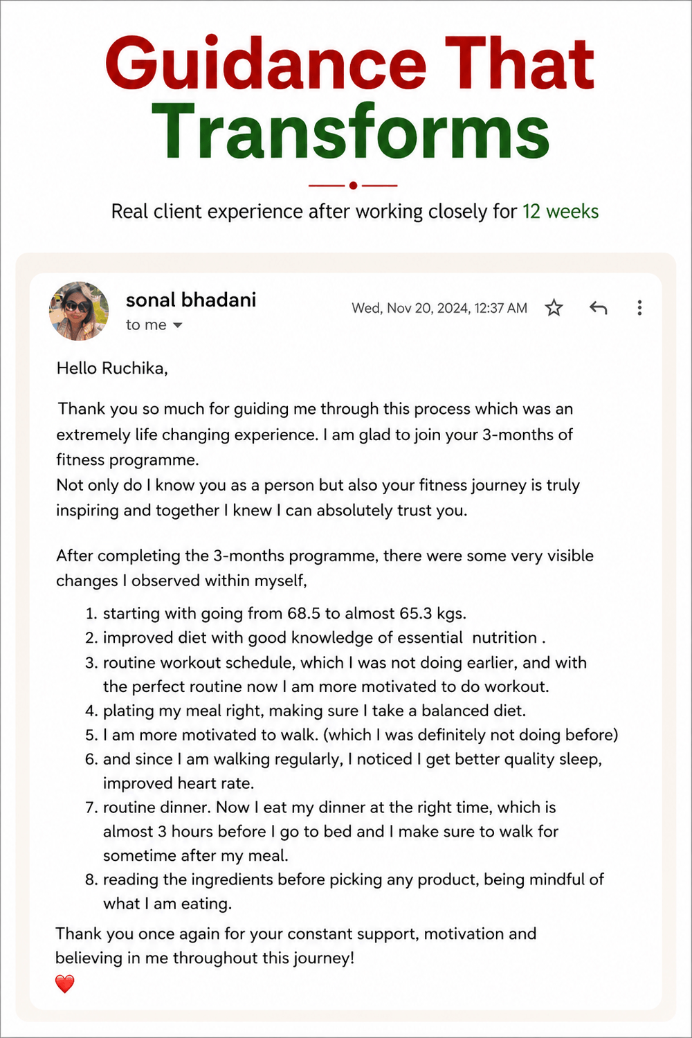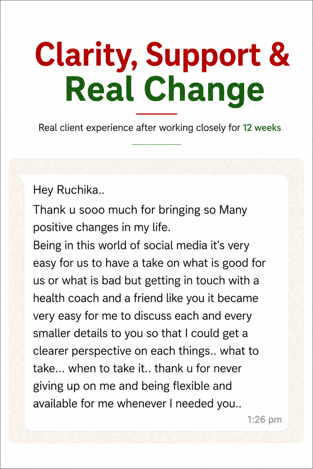Working with Ruchika gave me a lot of clarity and structure. Now I feel more energetic, my day feels more balanced, and I don’t feel overwhelmed about my health anymore.”